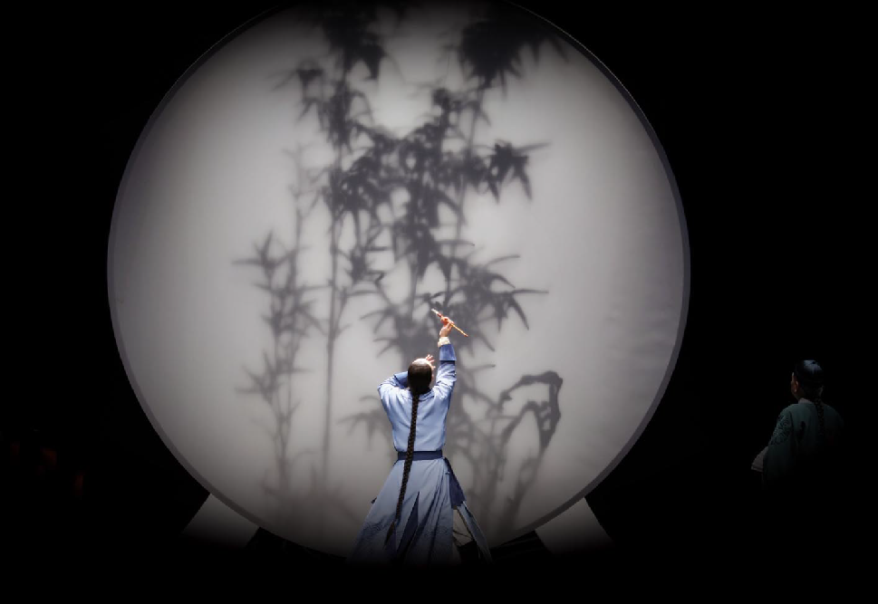 舞臺(tái)上,古琴與琵琶的悠揚(yáng)旋律仿若一陣清風(fēng),輕輕拂開(kāi)歷史的畫(huà)卷,清代揚(yáng)州的風(fēng)情萬(wàn)種如詩(shī)如畫(huà)般徐徐展開(kāi)。鄭板橋筆下的竹、蘭、石化作他性格的三種特質(zhì),生動(dòng)地展現(xiàn)了為官之德、書(shū)生之質(zhì)、為民之心,以及他對(duì)生命價(jià)值的執(zhí)著堅(jiān)守,深深地震撼著每一位觀者的心靈,讓他們沉浸其中,心潮澎湃。