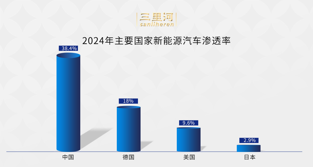 崔東樹提供的數(shù)據(jù)顯示,2024年,中國新能源汽車滲透率達(dá)到38.4%,德國達(dá)到18%,美國僅有9.6%,日本僅有約3%。世界汽車產(chǎn)業(yè)格局正發(fā)生變化。