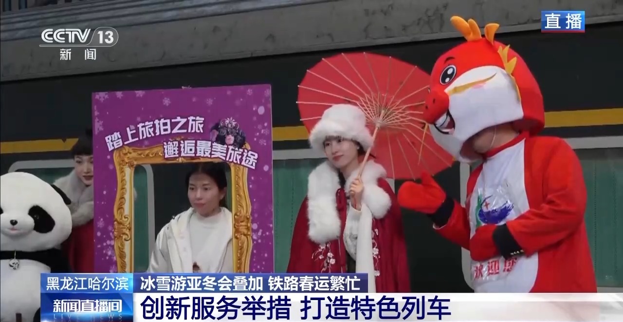 在春運期間,鐵路部門還打造了特色主題列車,比如現(xiàn)在已經(jīng)開通的“旅拍列車”。車上設(shè)置了哈爾濱街景、民俗文化、冰雪奇遇等主題場景,車上還有化妝間、更衣室,可以為旅客提供多種風(fēng)格的旅拍服飾,旅客可以通過手機小程序進行預(yù)約。拍攝人員也是由愛好攝影的鐵路職工組成的旅拍團隊,大家都是利用業(yè)余時間為旅客免費提供服務(wù)。