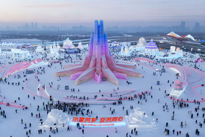 2025年1月5日,在哈爾濱冰雪大世界園區(qū),游客在主塔“亞洲同心”附近游玩(無人機(jī)照片)。新華社記者 謝劍飛 攝