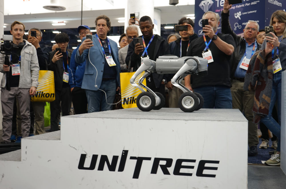 1月8日,在美國(guó)拉斯維加斯,人們?cè)谥袊?guó)企業(yè)宇樹科技的展區(qū)觀看機(jī)器狗展示。新華社發(fā)(曾慧攝)