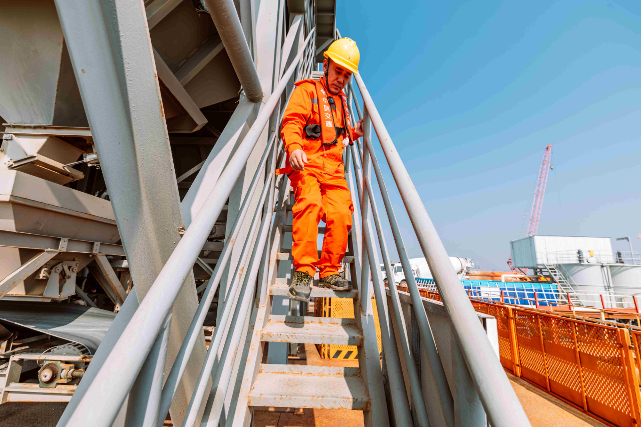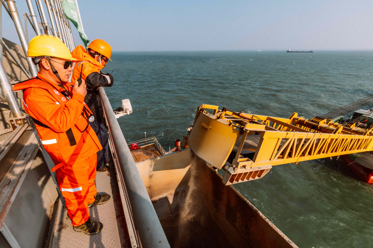 1月17日,夕陽(yáng)下的廈門劉五店港區(qū),北風(fēng)勁吹。在距離中交一公局集團(tuán)廈金大橋(廈門段)項(xiàng)目海上平臺(tái)混凝土操作員梁芝敬站立位置不到30米的洋面上,一艘船身印有“帆順168”字樣的補(bǔ)料船,裝載著4000多噸砂石緩緩抵近。船頭前方延伸出一條25米長(zhǎng)的傳送皮帶,將船上的砂料源源不斷地送抵老梁眼前的鋼制固料斗內(nèi)。當(dāng)天他們要趁著海水退潮帶來(lái)的作業(yè)窗口,為站里補(bǔ)上700噸機(jī)制砂和900噸粒徑10到20毫米的小石子,以確保混凝土站生產(chǎn)不停機(jī)。