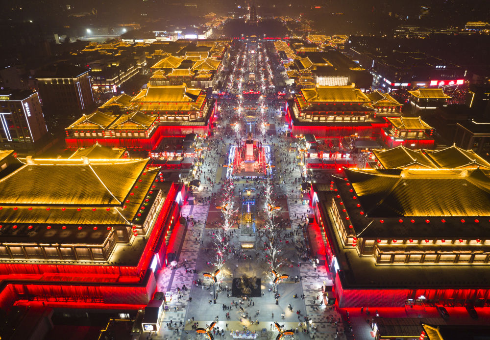 西安大唐不夜城景色(1月22日攝,無人機照片)。新華社記者 邵瑞 攝