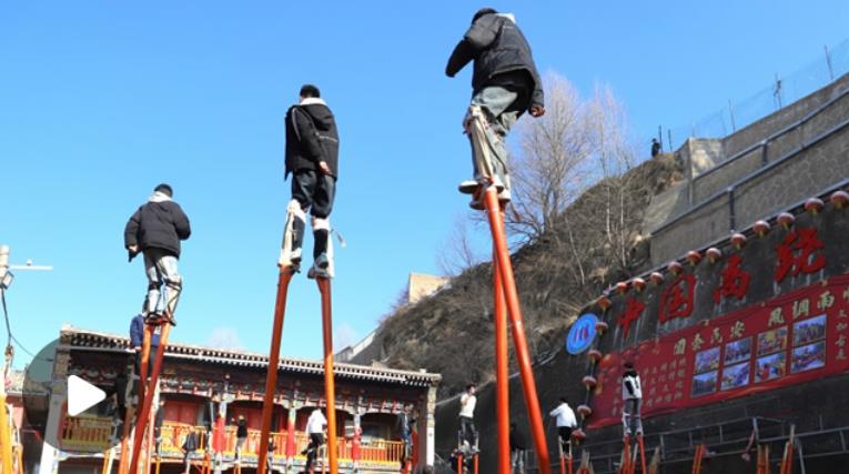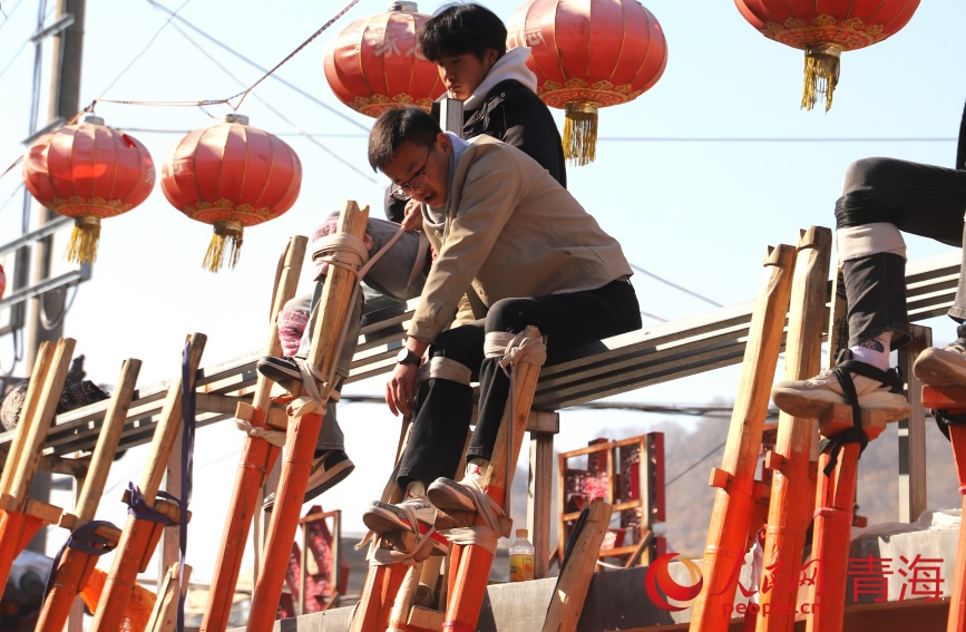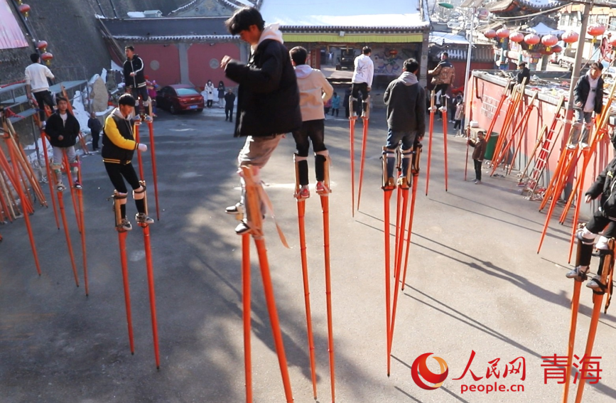綁蹺、試蹺、定蹺……青海省西寧市湟中區(qū)魯沙爾鎮(zhèn)火神廟,魯沙爾高蹺隊迎來了春節(jié)前最后一次排練?!皬呐D月初一到現(xiàn)在二十多天了,今年大家積極性很高,報名的人也多,排練效果不錯?!弊龊脺?zhǔn)備,隨著社火音樂的鼓點舞動起來,魯沙爾鎮(zhèn)高蹺協(xié)會會長李玉龍站在臺階上看著排練隊形。