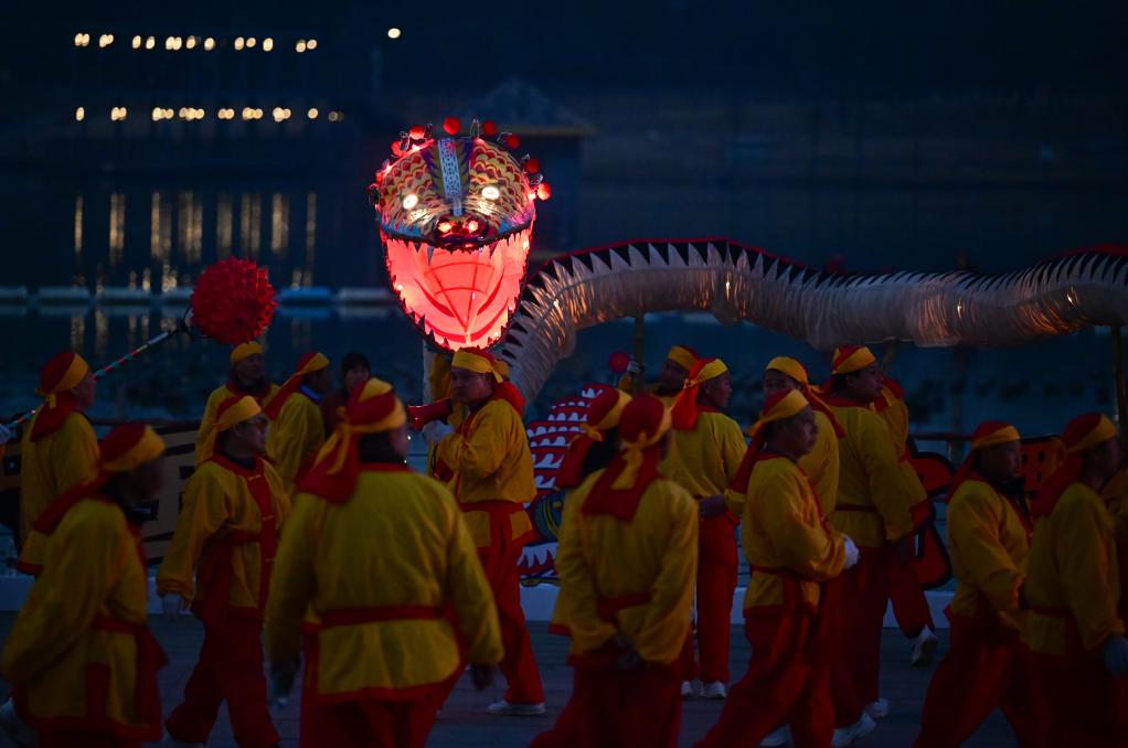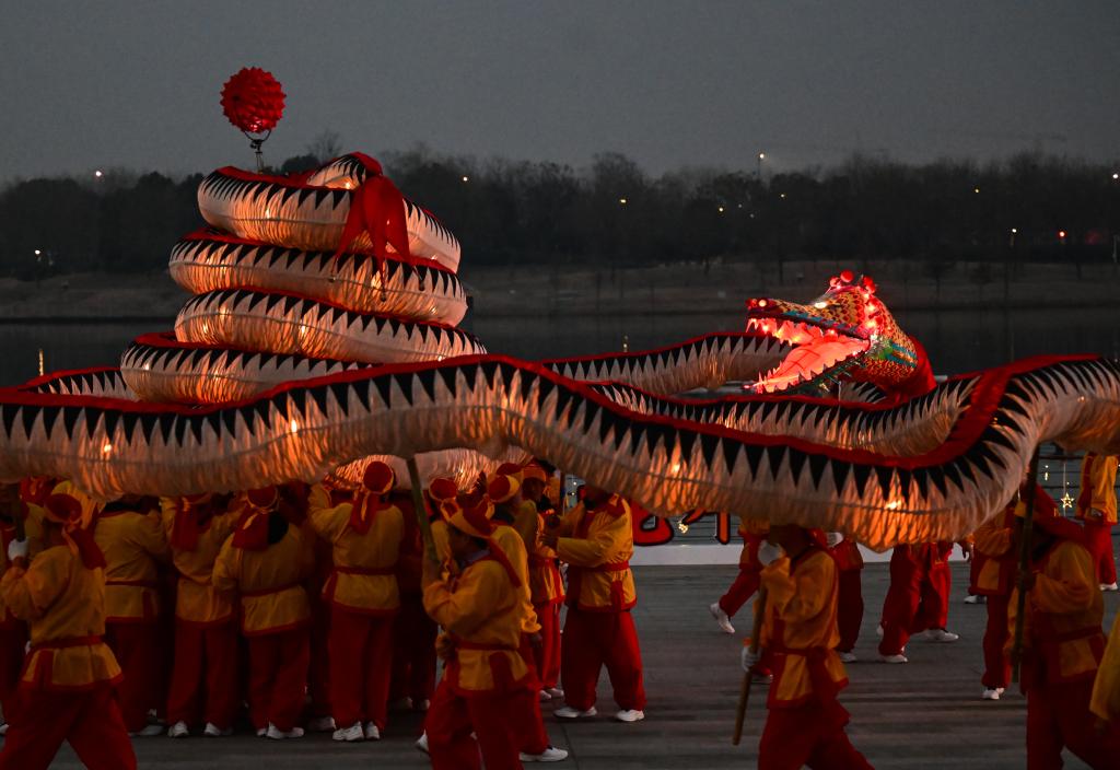 “出燈啦!”隨著一聲號令,鼓樂齊鳴,長達(dá)128米的“肥東洋蛇燈”起身游走,光彩靈動。蛇年春節(jié)臨近,安徽省合肥市肥東縣的和睦湖畔,通體流光的洋蛇燈在夜色中時(shí)而昂首,似騰空而去,時(shí)而垂頭,如蓄勢待發(fā)。