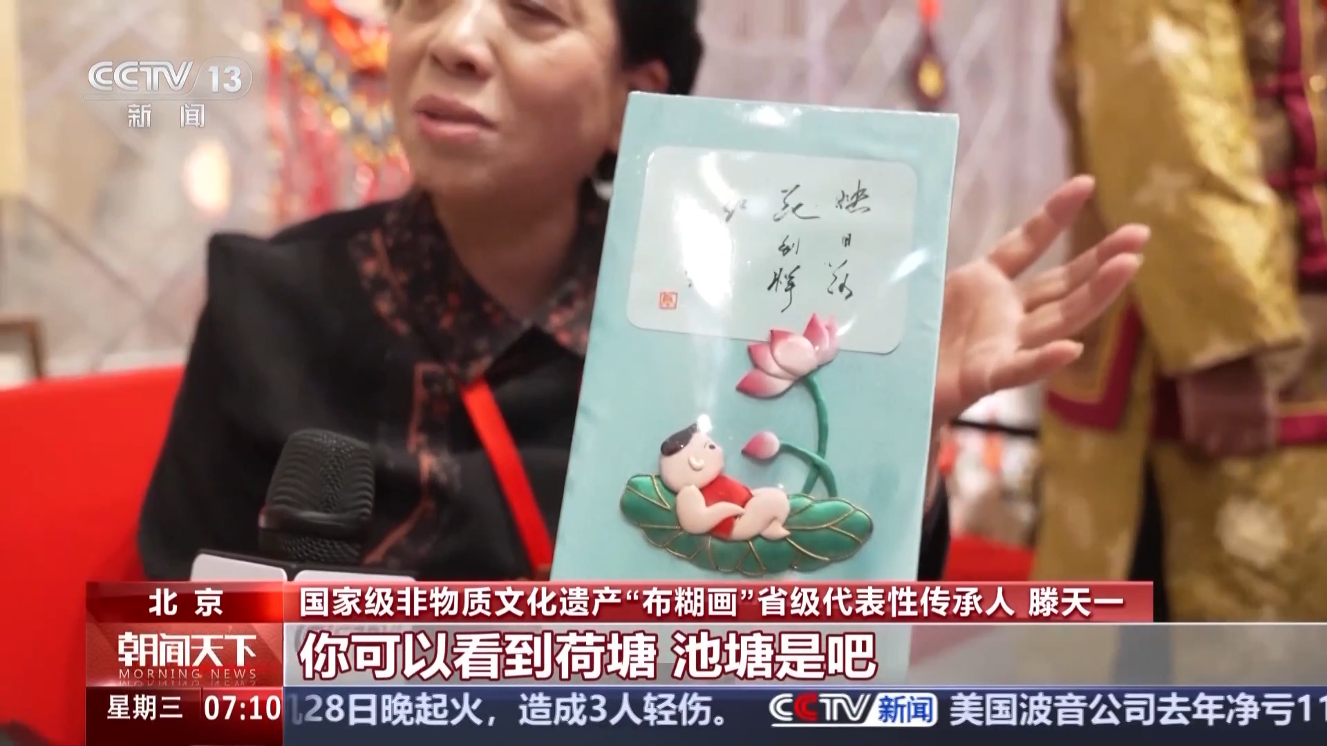 北京國(guó)家級(jí)非物質(zhì)文化遺產(chǎn)“布糊畫”省級(jí)代表性傳承人 滕天一:很多手工掛件做完了到不了一分鐘就買走了。從古到今幾千年了,我們中國(guó)的東西到哪兒你細(xì)看,它是有內(nèi)涵的東西。比如說(shuō)我拿了楊萬(wàn)里的一句詩(shī)“映日荷花別樣紅”你可以看到荷塘、池塘是吧,再想到我們的詩(shī)、詩(shī)人,它都是有意境的。