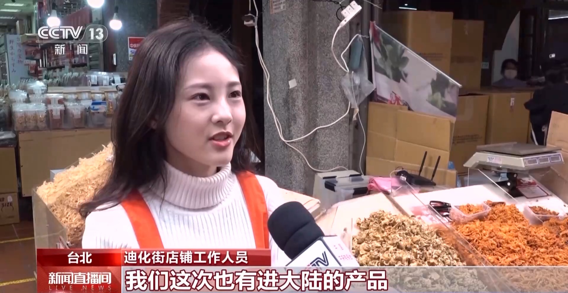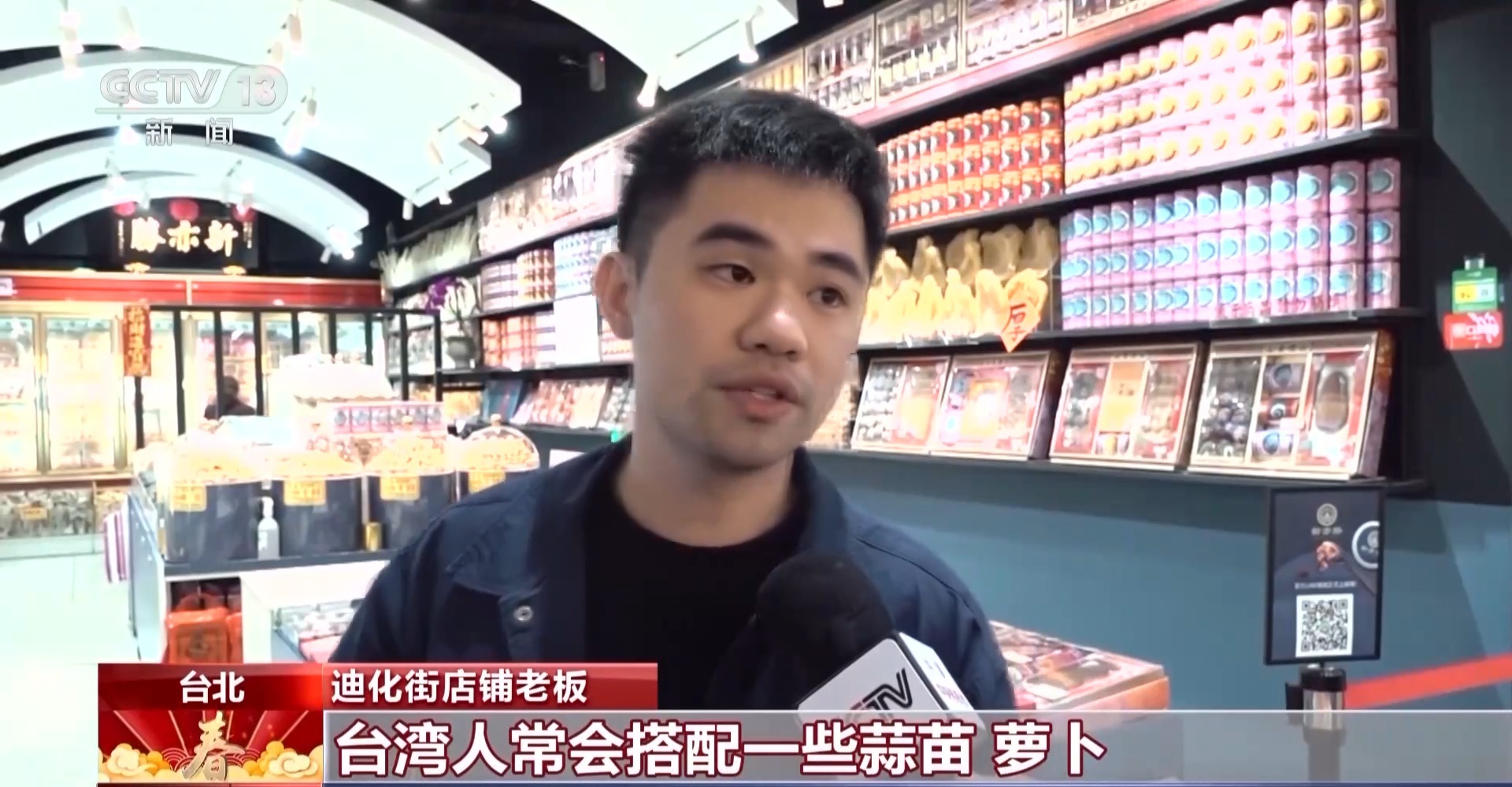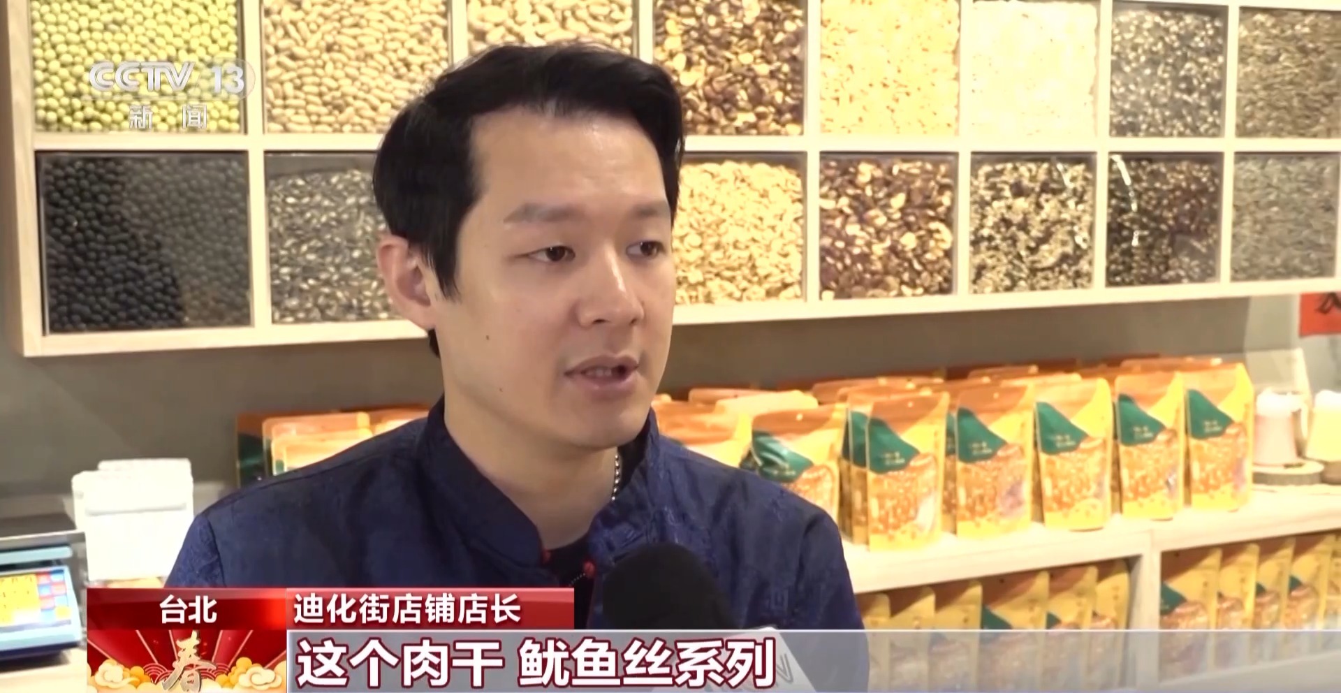 迪化街店鋪店長:春節(jié)期間大部分人家會選擇這個肉干、魷魚絲系列,還有我們擺放漂亮的糖果系列為主要的采購商品。