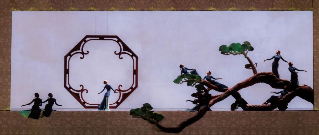 這是一幅工筆畫般的舞蹈,“細膩的平面美”貫穿始終。多處剪影的運用更是剝離了立體細節(jié),只留下氣韻流轉(zhuǎn)的線條,將所有的視覺重心都集中在平面構(gòu)圖之中。整個畫卷上,舞者化身成畫布上精心點綴的筆觸,風枝搖綠影,鵲語落花間,每一個動作的鋪陳、每一次舞姿的凝固,都精致得令人屏息。