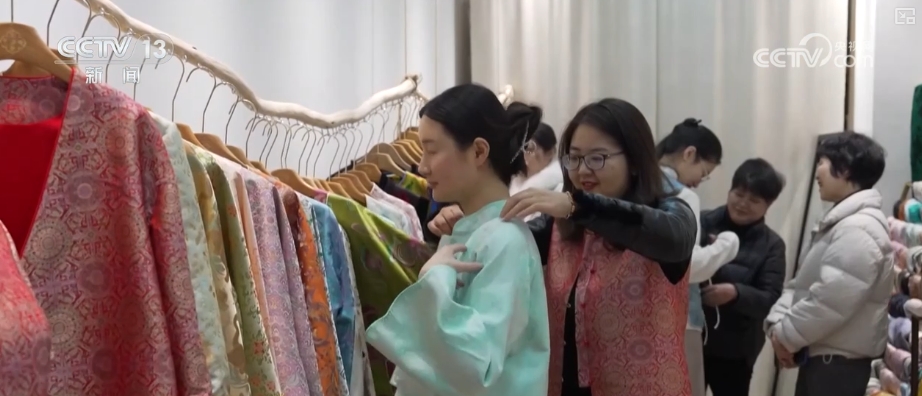 在浙江杭州的一家新中式服裝定制店內,不少年輕顧客正在試穿、挑選。