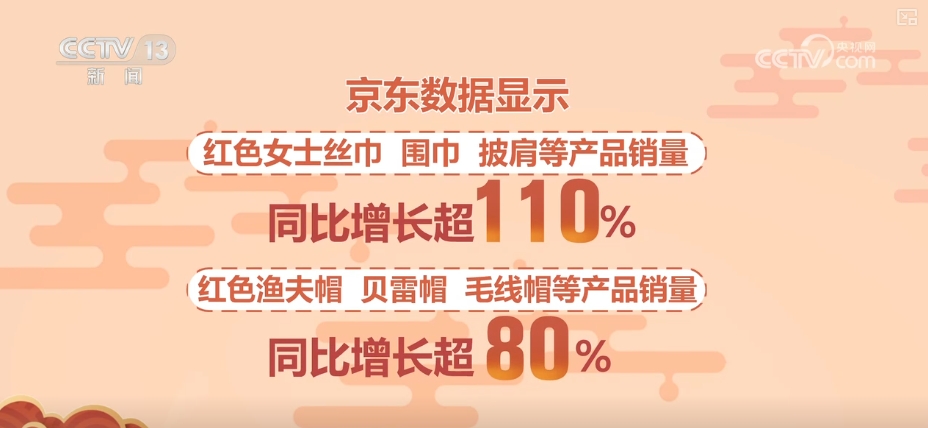 不僅是新年“戰(zhàn)袍”,新年配飾也要配齊。京東數(shù)據(jù)顯示,2025年,紅色的毛衣鏈銷量同比增長超七倍,紅色手鏈、腳鏈、戒指銷量同比增長超100%。也有很多用戶選擇用紅色帽子、圍巾來增添節(jié)日氛圍,紅色女士絲巾、圍巾、披肩等產(chǎn)品銷量同比增長超110%,紅色漁夫帽、貝雷帽、毛線帽等產(chǎn)品銷量同比增長也超過了80%。