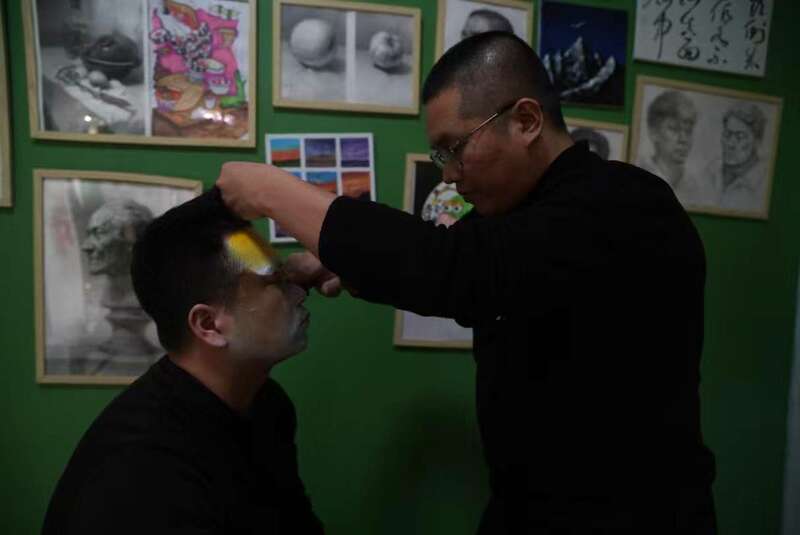 每次演出前,李曉濤要“擇臉”,決定哪張臉化哪個妝,臉大的演員有優(yōu)勢,承得下更復雜更多細節(jié)的妝容;額頭高的人可以畫上半張臉細節(jié)更多的“三塊瓦”。畫著同一底色的演員表演時不能站在一起,以免觀眾有重復的感覺。