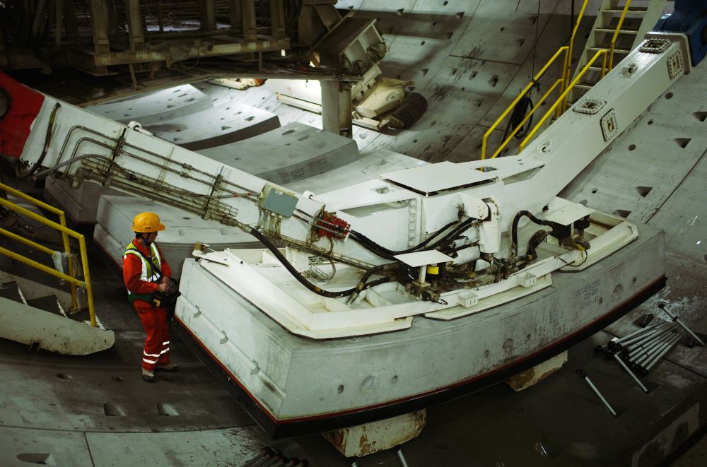 點點“星光”盡頭,拼裝班長周洪強操作伸縮機,將一塊隧道管片緩緩抓起。穩(wěn)穩(wěn)平移、旋轉(zhuǎn)過后,12噸重的管片精準落位。