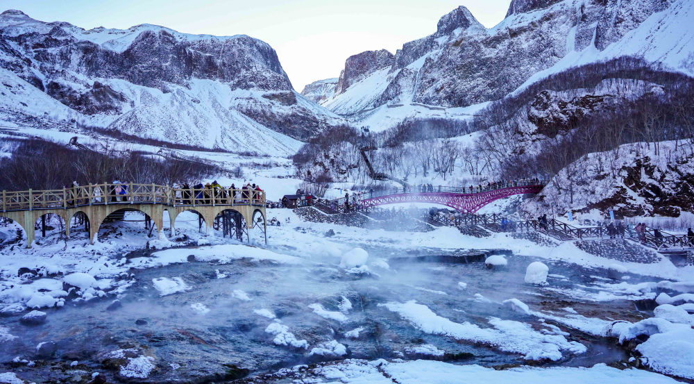長白山天池以北的延邊州,溫泉室外的樹枝上覆滿積雪,泡池內(nèi)滾燙的地?zé)嵩丛床粩唷I斐瞿_尖觸水,一股暖意傳遍全身。延邊云集安圖火山泉、龍井氟溫泉、延吉低氘溫泉等多種特色溫泉,吸引海內(nèi)外眾多游客慕名而來。
