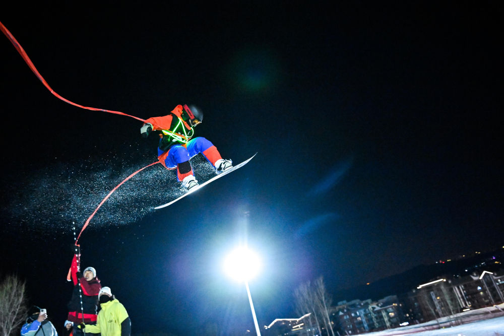 滑雪愛好者在進(jìn)行滑雪趣味跳高賽 顏麟蘊(yùn) 攝