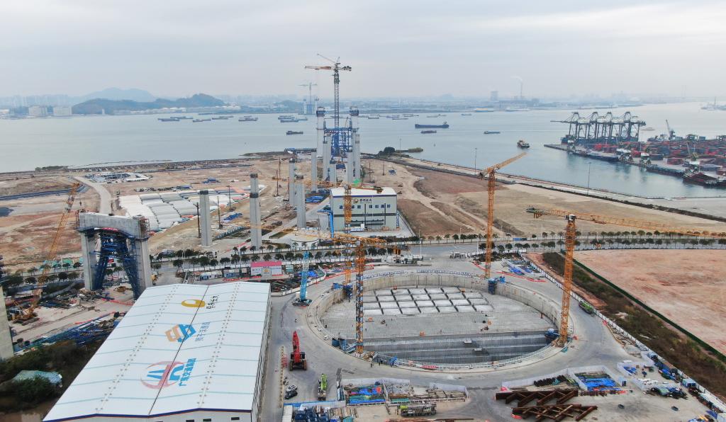 在珠江口東岸的東莞沙田鎮(zhèn)的施工現(xiàn)場,獅子洋大橋的東主塔正進(jìn)入主塔橫梁施工階段。建設(shè)者們有的在焊接鋼筋,有的在吊運(yùn)材料。12根引橋墩柱成對(duì)排列,勾勒出平滑優(yōu)美的弧線,向遠(yuǎn)處直徑127米的超大錨碇延伸而去。