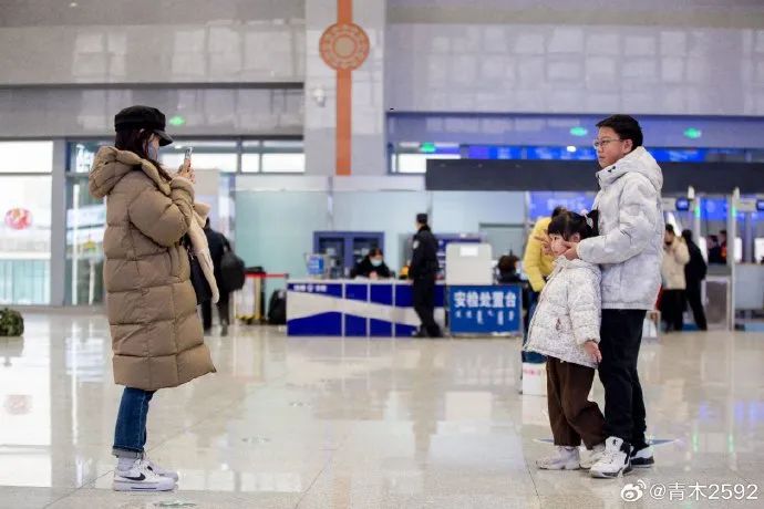 在外地上班的于女士,帶著女兒和前來(lái)送站的親人在車站內(nèi)合影留念。