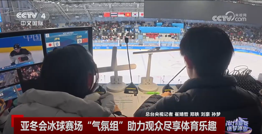 央視網(wǎng)消息:冰球比賽對(duì)抗激烈,運(yùn)動(dòng)節(jié)奏快、場(chǎng)面精彩。第九屆亞冬會(huì)冰球項(xiàng)目賽場(chǎng)之一的哈爾濱冰球館,有這樣一個(gè)體育展示團(tuán)隊(duì),他們被稱為“氣氛組”,通過(guò)音樂(lè)、燈光、大屏幕、觀眾互動(dòng)等多手段,讓觀眾一起享受比賽。