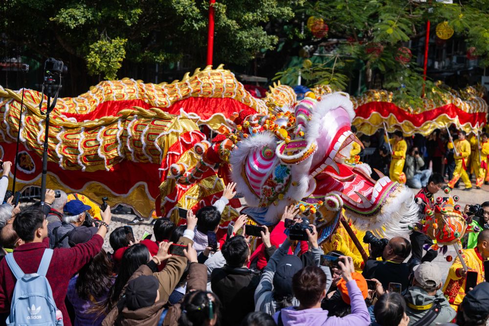 靈動的金龍穿梭于大街小巷之中,騰挪跳躍、盤旋飛舞,所到之處吸引大量市民和旅客,街道水泄不通。