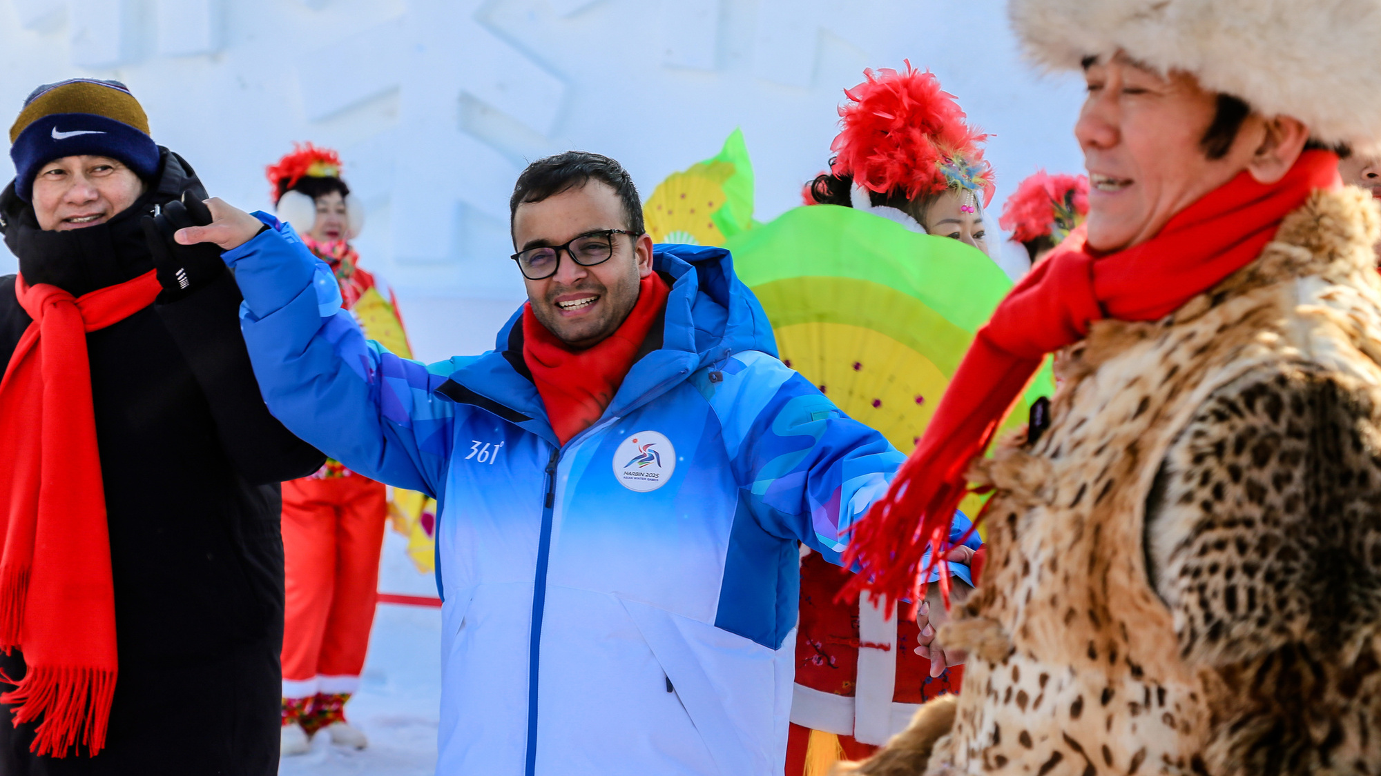 第九屆亞冬會(huì)在哈爾濱舉辦期間,一場(chǎng)主題為“當(dāng)亞冬會(huì)遇上非遺年——亞洲多國(guó)人士冰城同慶新春”的人文交流活動(dòng)在哈爾濱舉行?;顒?dòng)當(dāng)天,在哈爾濱雪博會(huì)中央廣播電視總臺(tái)演播室前的廣場(chǎng)上,20多人組成的民間秧歌隊(duì)在哈爾濱中央大街形象大使甲繼海的帶領(lǐng)下,為各國(guó)來(lái)賓激情演繹迎賓秧歌舞。