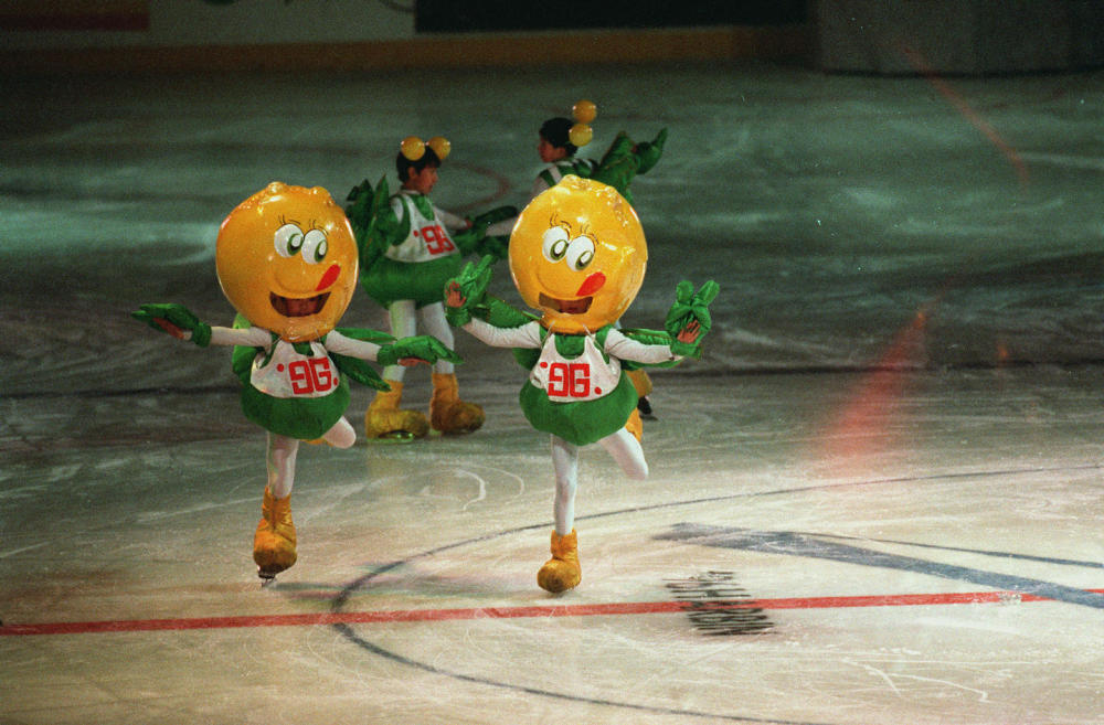 在哈爾濱舉行的第三屆亞冬會(huì)開(kāi)幕式上,大型藝術(shù)表演《太陽(yáng)·冰雪·亞細(xì)亞》中,本屆亞冬會(huì)吉祥物豆豆伴隨著活潑的兒歌,在冰上歡快地滑行。新華社記者 羅更前 攝(傳真照片,1996年2月5日發(fā))