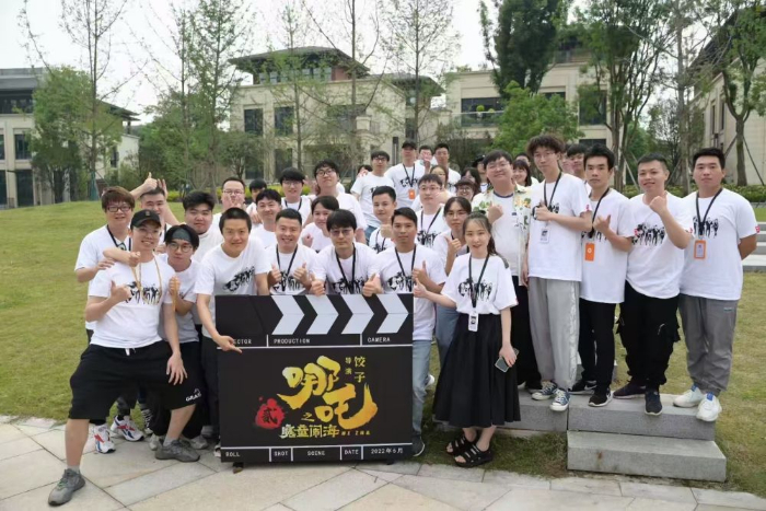 餃子導(dǎo)演(前排左三)和參與《哪吒之魔童鬧?!罚ā赌倪?》)制作的四川傳媒學(xué)院部分師生合影。從動(dòng)畫特效、制片到配音,四川傳媒學(xué)院多位師生參與了該電影的制作(資料照片)。新華社發(fā)