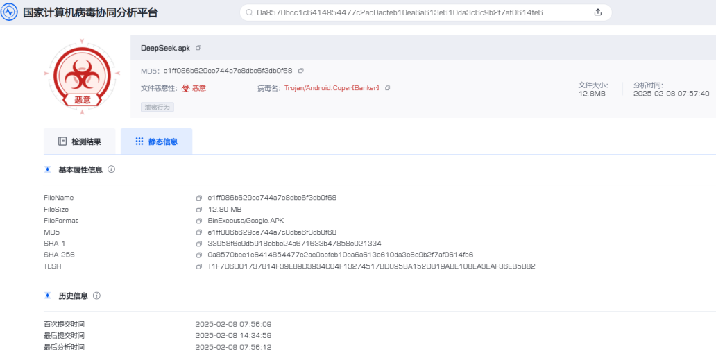 近日,國家計(jì)算機(jī)病毒應(yīng)急處理中心和計(jì)算機(jī)病毒防治技術(shù)國家工程實(shí)驗(yàn)室依托國家計(jì)算機(jī)病毒協(xié)同分析平臺(virus.cverc.org.cn)在我國境內(nèi)捕獲發(fā)現(xiàn)針對我國用戶的仿冒我國國產(chǎn)人工智能大模型“DeepSeek”官方APP的安卓平臺手機(jī)木馬病毒,如圖1、圖2所示。