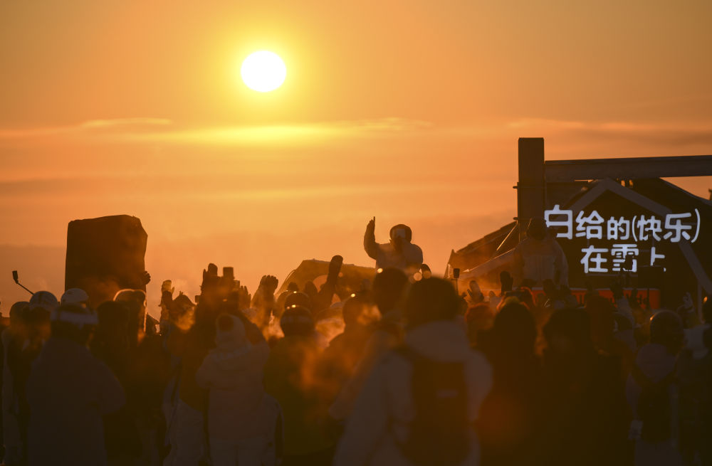 落日余暉灑在阿勒泰市將軍山國(guó)際滑雪度假區(qū)的山頂,漫山白雪被染成橙粉色。在現(xiàn)場(chǎng)電子音樂強(qiáng)勁的鼓點(diǎn)中,上千名滑雪愛好者歡呼搖擺,在零下十幾度的雪地里感受“蹦雪迪”的歡快。