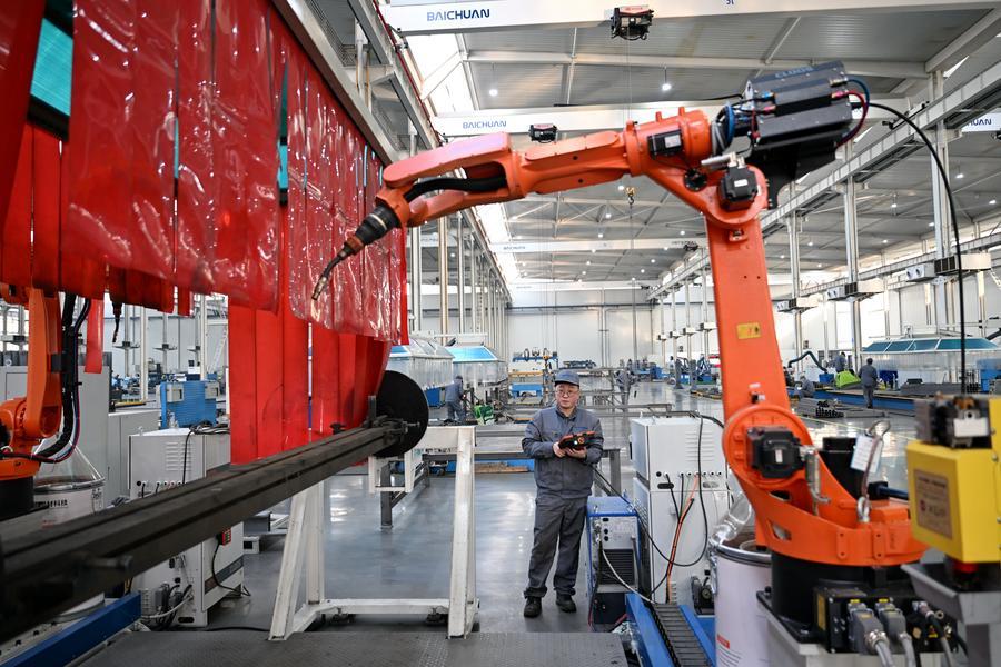 2月18日,工人在唐山國家高新技術產(chǎn)業(yè)開發(fā)區(qū)中信重工開誠智能裝備有限公司車間內調試機器人產(chǎn)品。新華社記者 牟宇 攝