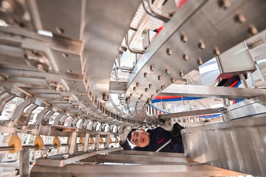 2月14日,在山東省青州經(jīng)濟開發(fā)區(qū)一家灌裝設備制造企業(yè),工人在車間內裝配作業(yè)。新華社發(fā)(王繼林攝)