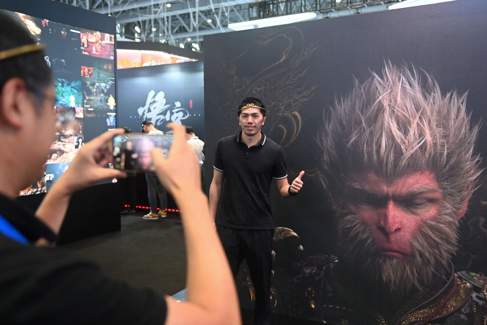 2024年9月25日,觀眾在第三屆全球數(shù)字貿易博覽會的游戲科學展區(qū)打卡。新華社記者 黃宗治 攝