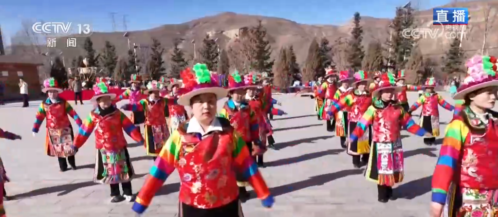 記者來到班彥村的村口廣場(chǎng)看到,三十多位土族姑娘和小伙子們身穿鮮艷的民族服飾,手挽手肩并肩,跳起土族傳統(tǒng)舞蹈——安召舞,為即將到來的互助縣農(nóng)歷“二月二”傳統(tǒng)擂臺(tái)廟會(huì)暨“非遺宣傳周”展示活動(dòng)做準(zhǔn)備。歡快的節(jié)奏真的是非常有感染力,每個(gè)人身上似乎都洋溢著火一般的熱情。