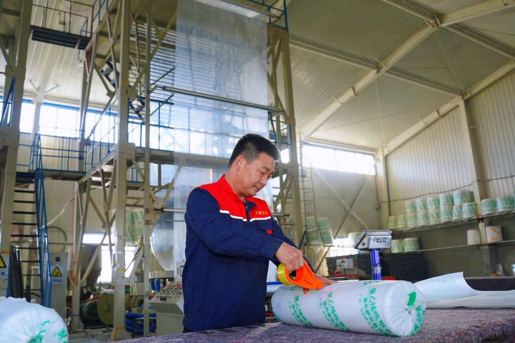 春耕備耕離不開(kāi)充足的農(nóng)資供應(yīng)。在新疆昌吉回族自治州吉木薩爾縣三臺(tái)鎮(zhèn)天露節(jié)水材料有限公司的生產(chǎn)車(chē)間,制膜機(jī)器高速運(yùn)轉(zhuǎn),一卷卷嶄新的地膜源源不斷地“吐”出,工人們熟練地進(jìn)行切割、封裝、碼放等作業(yè)。