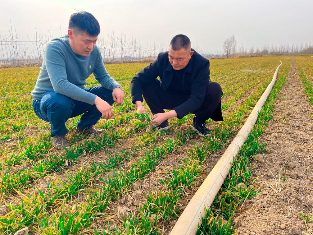 山東省嘉祥縣金屯鎮(zhèn)賀李胡村種糧大戶張春杰(左一)正在和村干部一同查看麥苗長(zhǎng)勢(shì)。(受訪對(duì)象供圖)