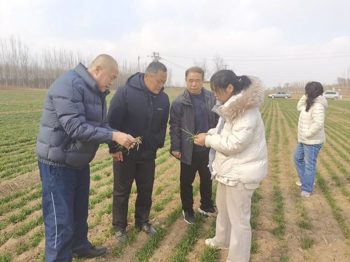山東省夏津縣農業(yè)農村局植物保護站站長、高級農藝師鄭曰英(右二)正在開展小麥苗情調查、病蟲害監(jiān)測,并指導糧農加強春季田管。