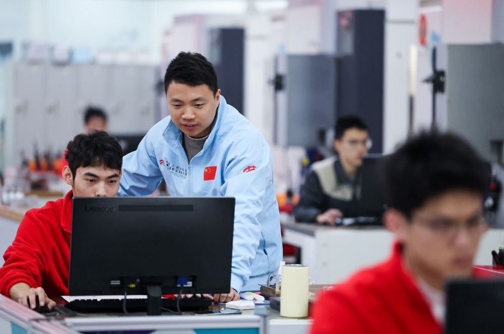 楊登輝(左二)指導學生對器件數(shù)控銑加工進行程序編程。