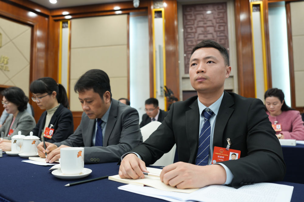 楊登輝(前右一)在十四屆全國人大三次會議廣東代表團全體會議上認真聽取發(fā)言。