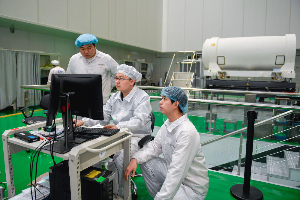 在長光衛(wèi)星相機裝調(diào)間,王升(右二)在調(diào)試衛(wèi)星光學遙感載荷組件時與團隊成員討論細節(jié)。