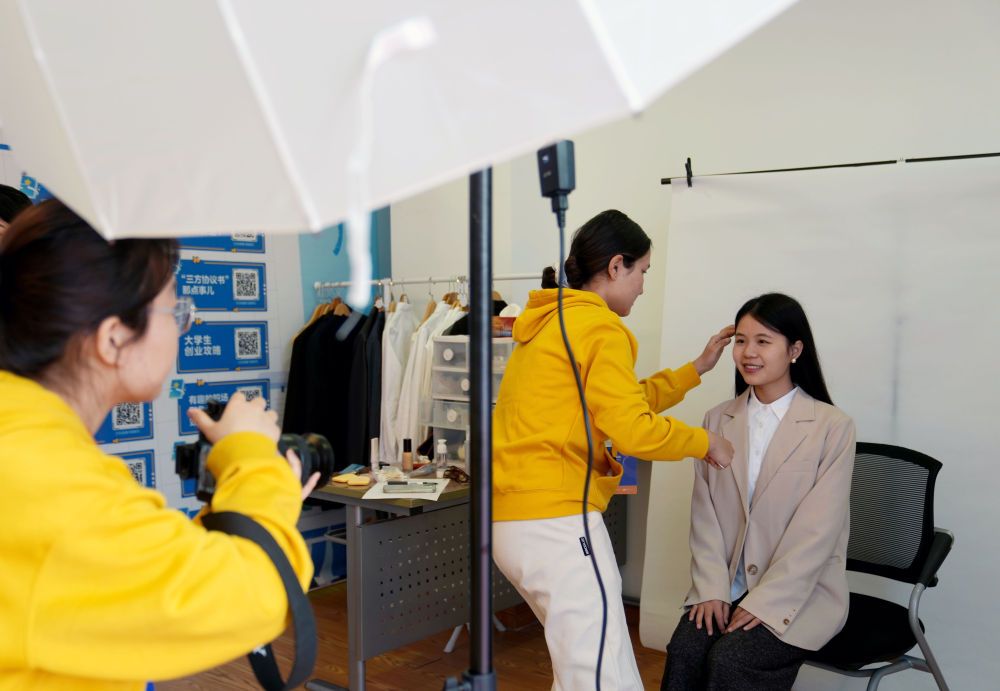 工作室的學生為求職學生拍攝形象照。