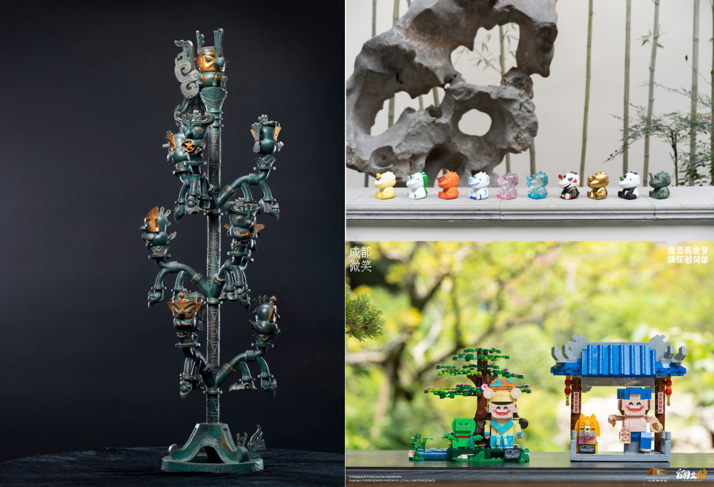 這是曾舟以青銅神樹、鎮(zhèn)水石犀、說唱俑等為原型設計的部分文創(chuàng)產(chǎn)品。