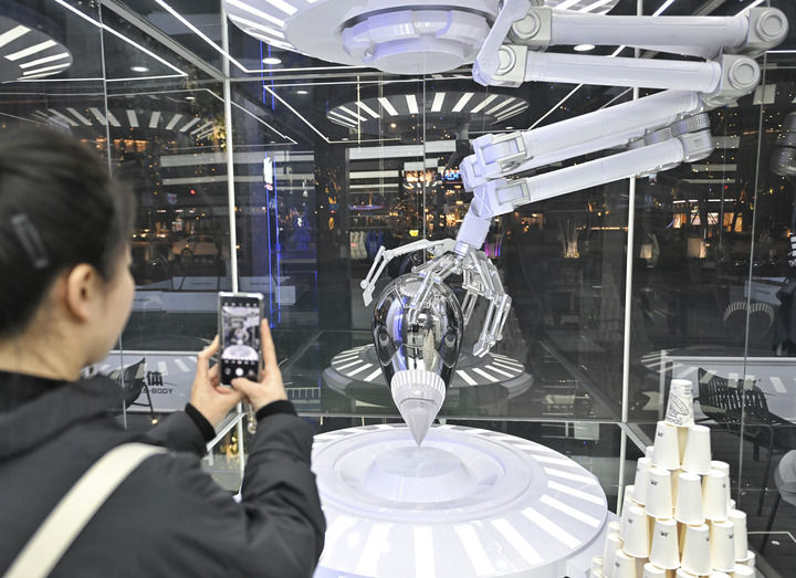 2025年1月5日,市民在位于成都交子大道的三體四維空間拍攝“水滴”。新華社記者 劉坤 攝