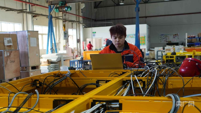 工作人員正在進(jìn)行重載AGV安裝調(diào)試(央廣網(wǎng)記者 周思楊 攝)