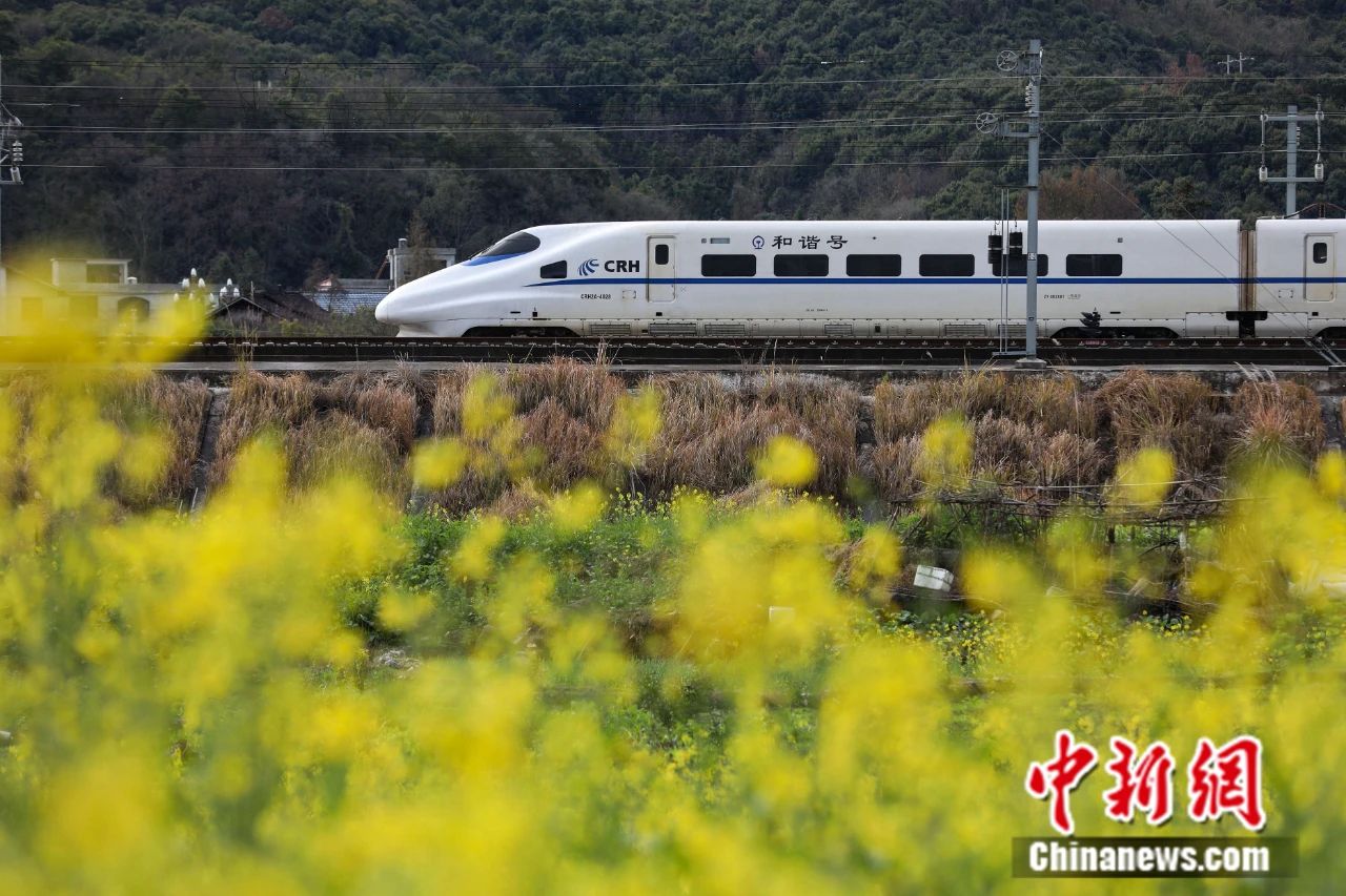 動(dòng)車組列車從貴廣高鐵黔東南州從江縣境內(nèi)的油菜花田旁駛過(guò)。中新社記者 瞿宏倫 攝