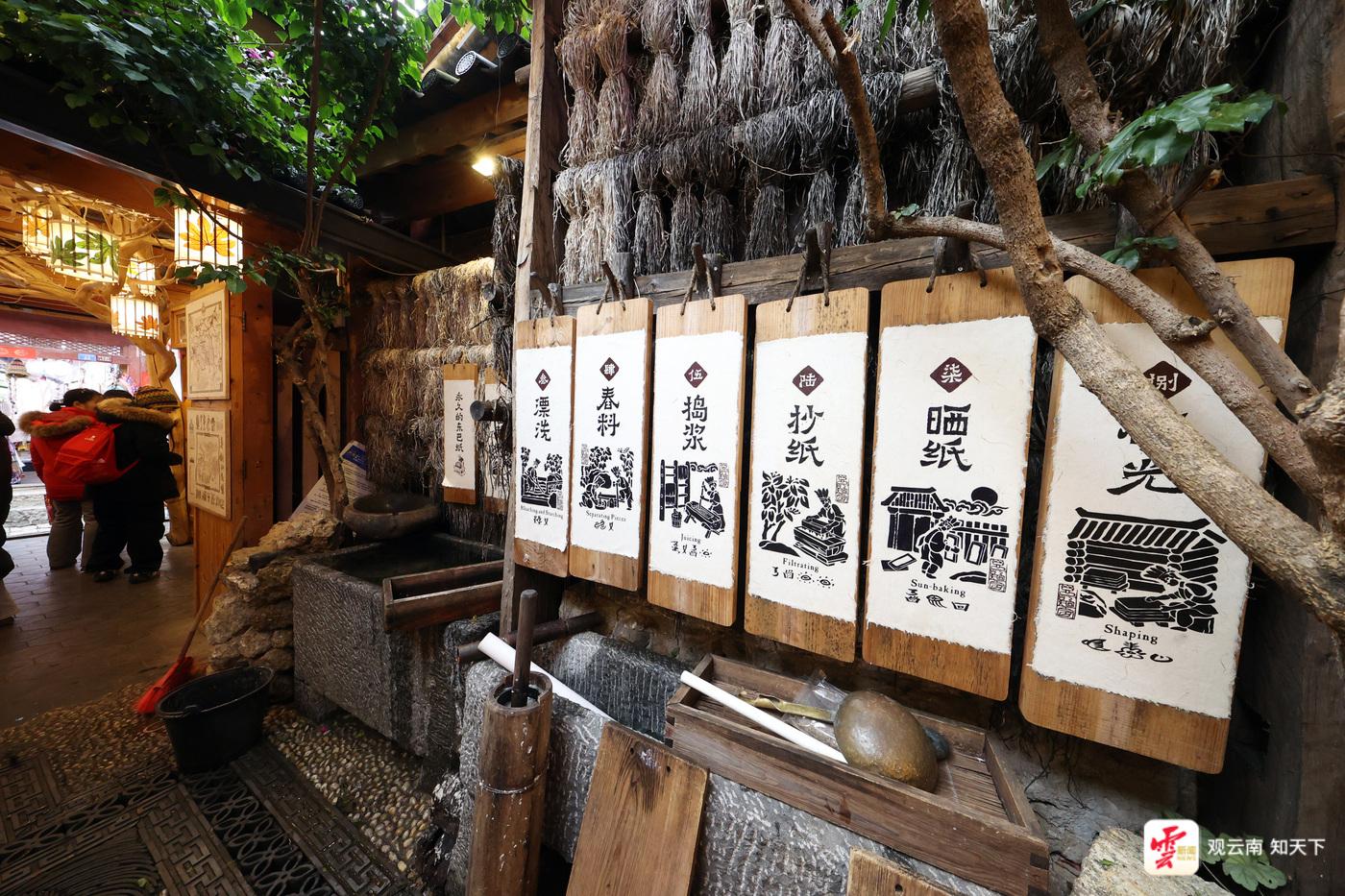 麗江古城內以東巴文化體驗為亮點的“東巴紙坊”吸引著許多中外游客。在這里,游客們可以體驗到搗漿、抄紙、曬紙等東巴紙制作工藝,還能拿起東巴象形文字印章集章打卡。如果你好奇某個象形文字的含義,還能在這里買到一本東巴文“字典”,一一對照查看?!跋啾韧辏衲甓嗔瞬簧賮碜孕录悠?、馬來西亞的游客,東巴紙燈、明信片都是很受他們喜愛的產品?!睎|巴紙坊麗江銷售人員韓雨辰說。