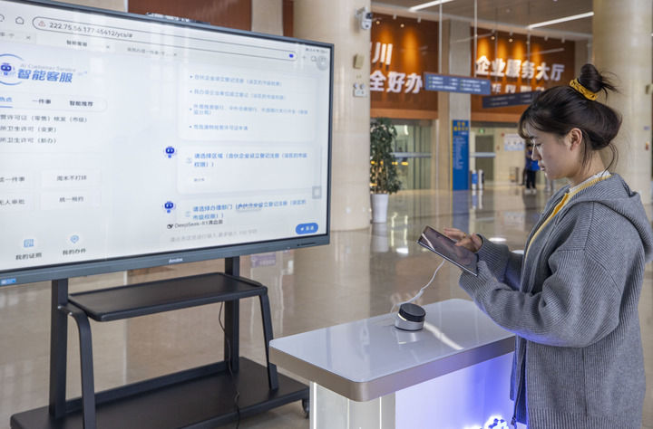 3月21日,辦事人員在銀川市審批服務(wù)管理局企業(yè)服務(wù)大廳使用智能客服查詢信息。新華社記者 楊植森 攝