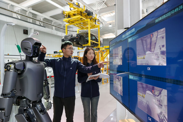 3月22日,在位于江蘇無錫的天奇股份人形機(jī)器人數(shù)據(jù)采集實(shí)訓(xùn)基地,工程師在調(diào)試人形機(jī)器人。新華社發(fā)(朱吉鵬攝)