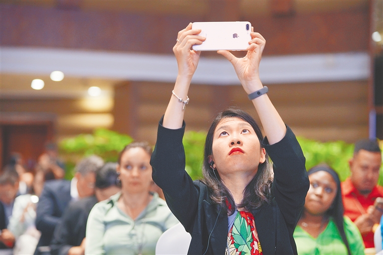 在全球自由貿(mào)易港發(fā)展論壇現(xiàn)場,與會嘉賓用手機記錄。海南日報全媒體記者 王程龍 攝