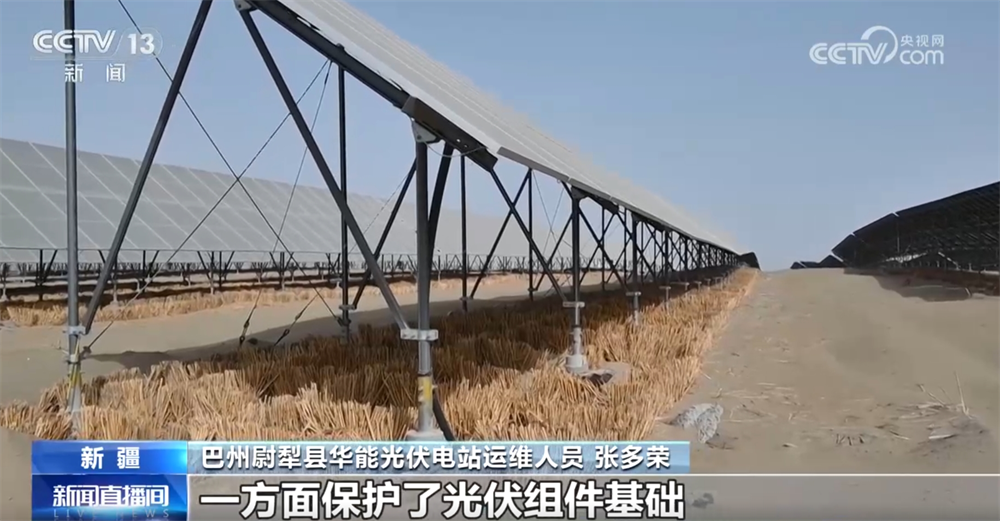 巴州尉犁縣華能光伏電站運維人員張多榮稱:“大概兩個月時間就能抽穗發(fā)芽了,一方面保護(hù)了光伏組件基礎(chǔ)不被黃沙掩埋或掏空,另一方面改善了周圍環(huán)境?!?/p>