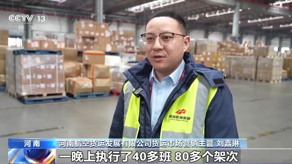 河南航空貨運發(fā)展有限公司貨運市場營銷主管 劉嘉琳:最繁忙的時候,一晚上執(zhí)行了40多班,80多個架次。每一個環(huán)節(jié)、每個時間節(jié)點我們都有監(jiān)控,哪個節(jié)點出現(xiàn)問題了,耽擱的時間比較長了,后臺對現(xiàn)場進行提醒。高峰期加派人員,大大提高了作業(yè)效率。