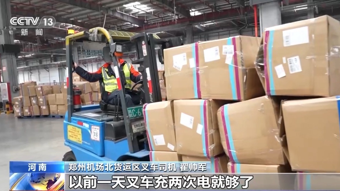 鄭州機場北貨運區(qū)叉車司機 翟帥軍:飛機航班多不多,裝得滿不滿,看我這邊就知道,以前一天叉車充兩次電就夠了,現(xiàn)在要充四次電。