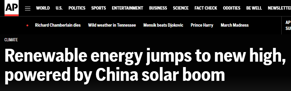 報(bào)道稱,中國太陽能熱潮推動(dòng)了全球可再生能源發(fā)展。數(shù)據(jù)顯示,2024年,中國可再生能源發(fā)電新增裝機(jī)約3.74億千瓦,其中四分之三來自太陽能發(fā)電。